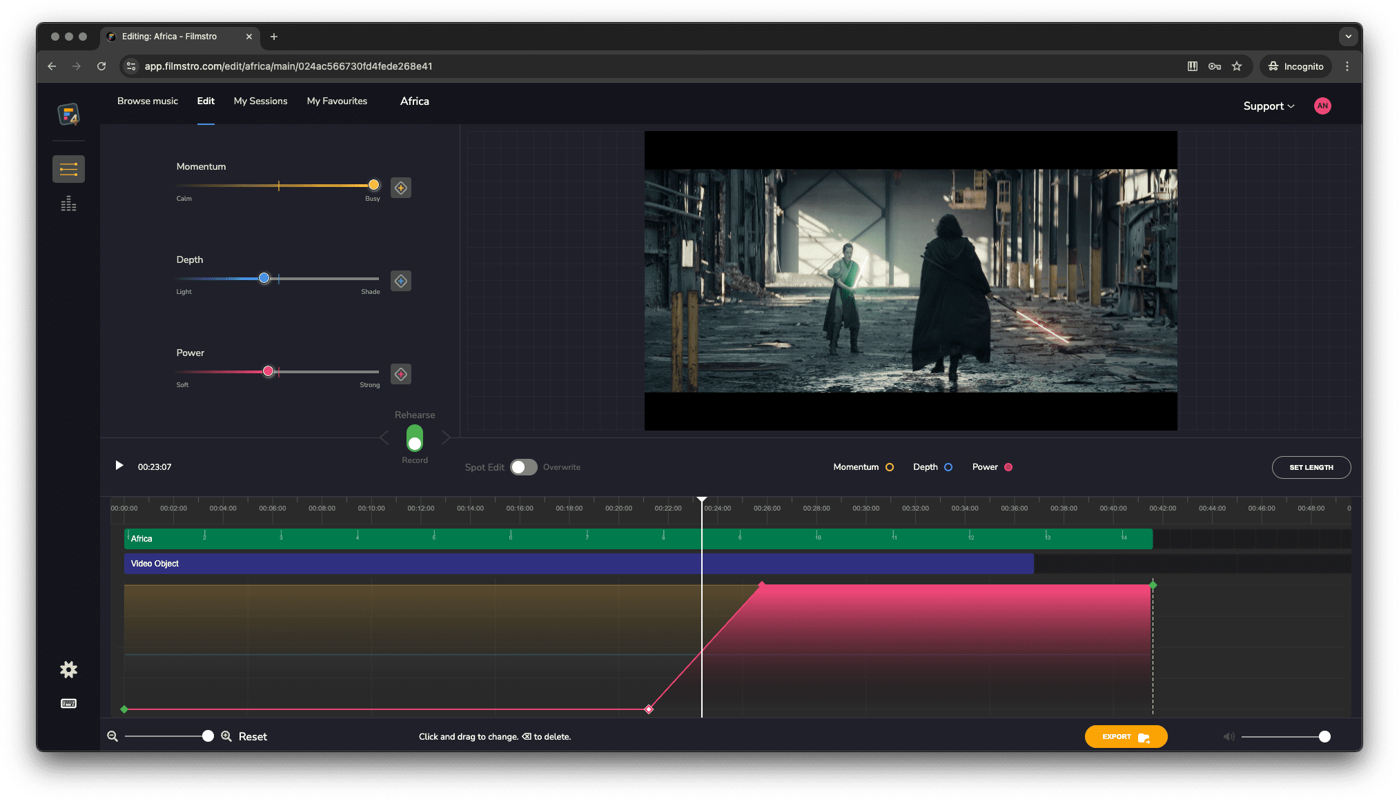 Editing music in the Filmstro Web App is very similar to editing video. Filmstro has been designed to feel familiar to anyone who uses an NLE such as Adobe Premiere Pro or DaVinci Resolve.