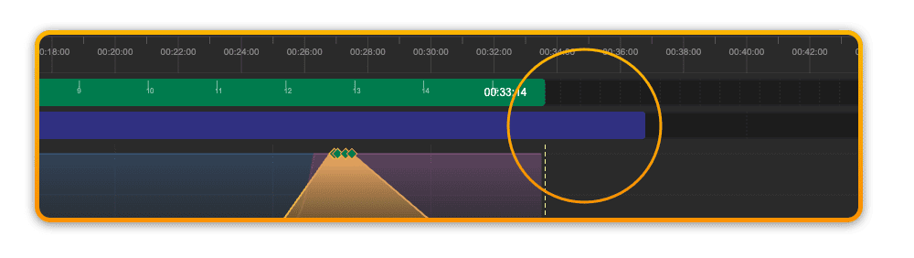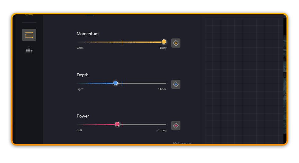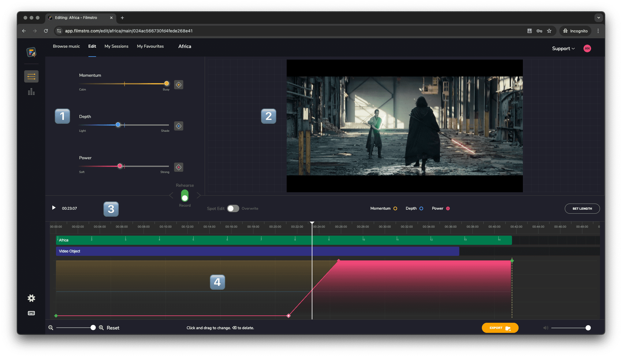 The Timeline contains the timeline indicator along with the video object (if a video is added) and the music object, which is the track you’ve chosen to edit. The main area below that contains the visual representation of the current settings for Momentum, Depth and Power. This will update as you make changes to the music.