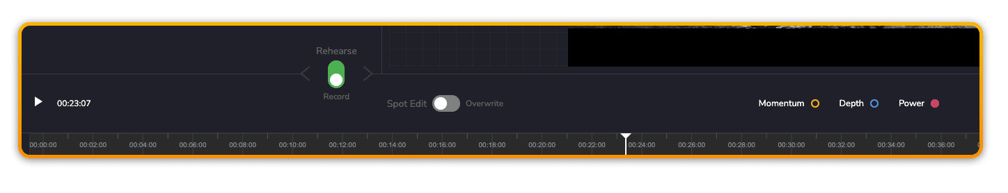 The main Transport contains the play/pause button, the SMPTE time display, a toggle for Rehearse/Record, a toggle for Spot Edit/Overwrite, and radio buttons for Momentum, Depth & Power.