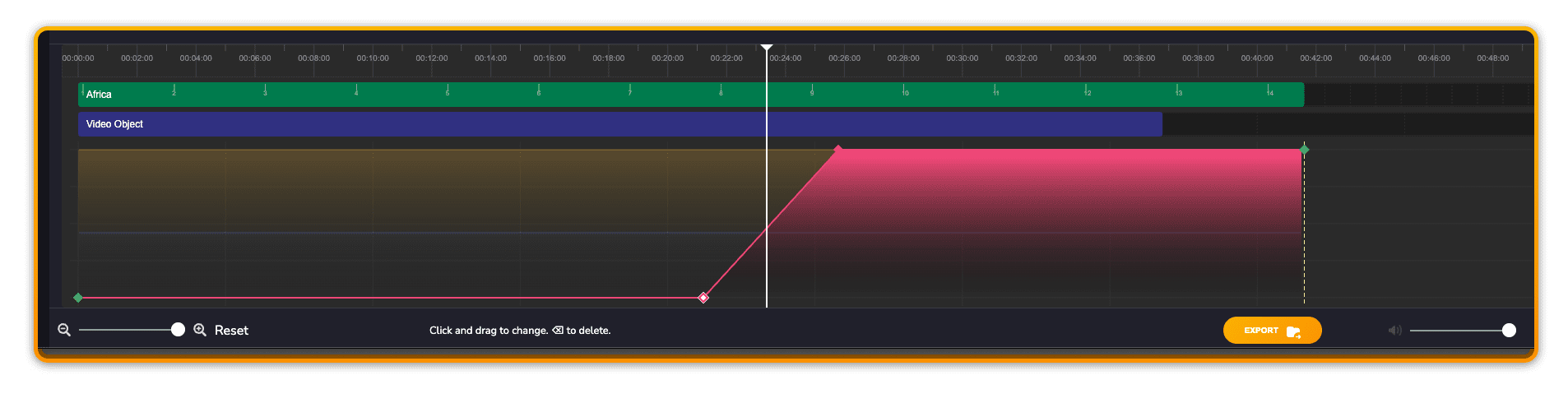 Below the timeline are controls for Zooming into the timeline horizontally. Here you will also find the main music volume and the Save/Export buttons.