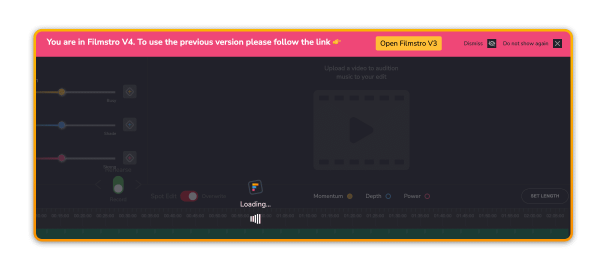 When you first open Filmstro you will see a banner with a link to the previous major version. Use this for any legacy sessions that you need access to.