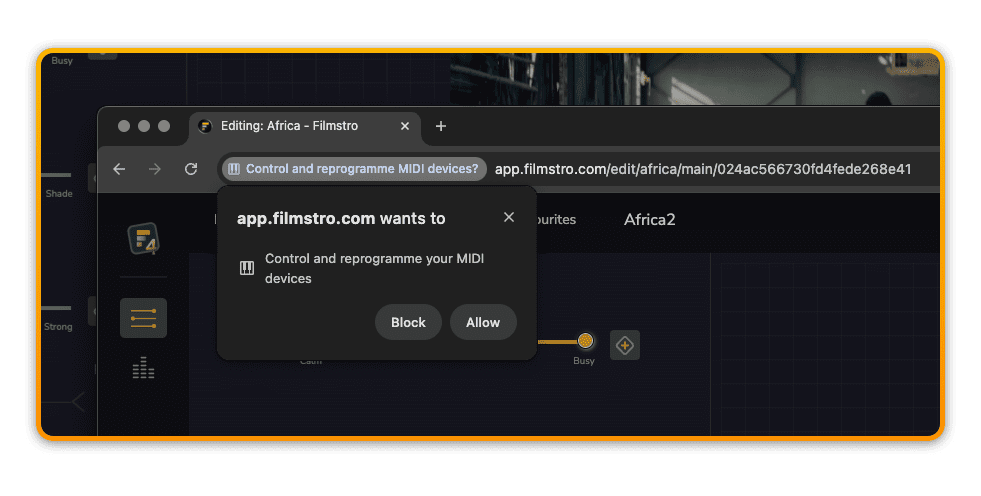 On initial load Filmstro will ask permission to access any connected MIDI controllers. Please click ‘Allow’.