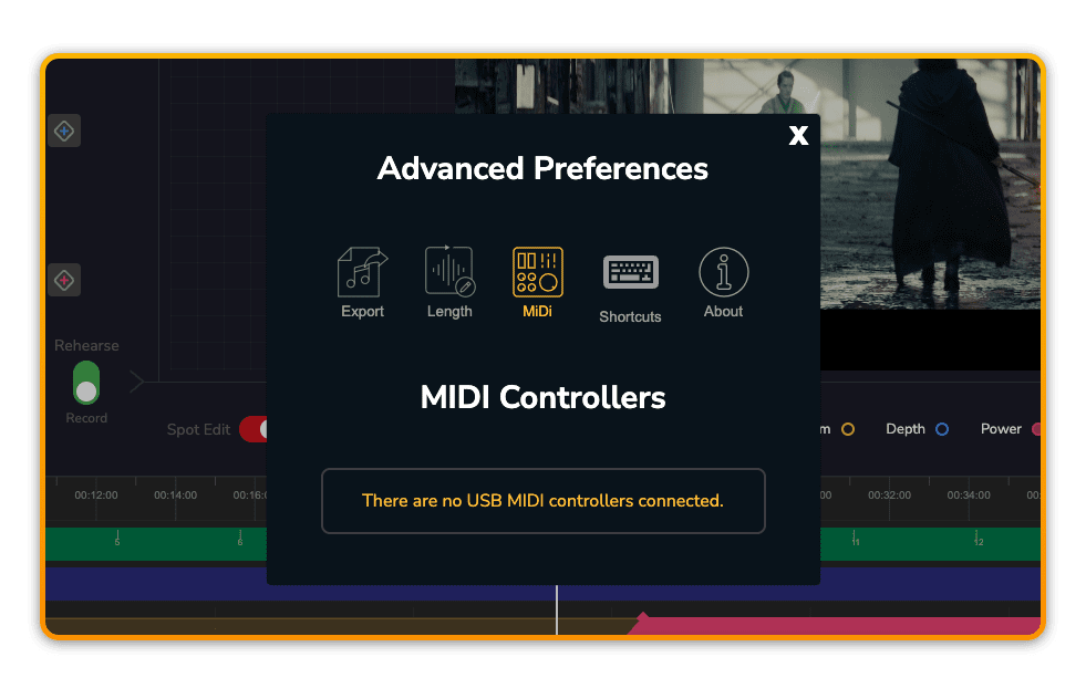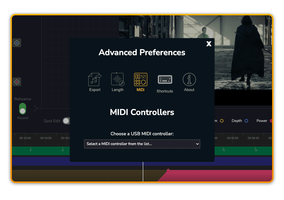 The MIDI settings allow you to add a hardware controller to drive Filmstro Pro’s Scoring Sliders. You can also use hardware to control the Transport.