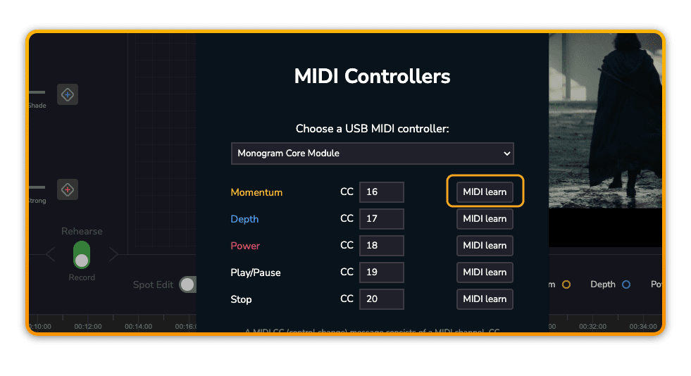 The most important step is to map your hardware controllers to Filmstro’s 3 main parameters. You can also map Play/Pause and Stop/Return.