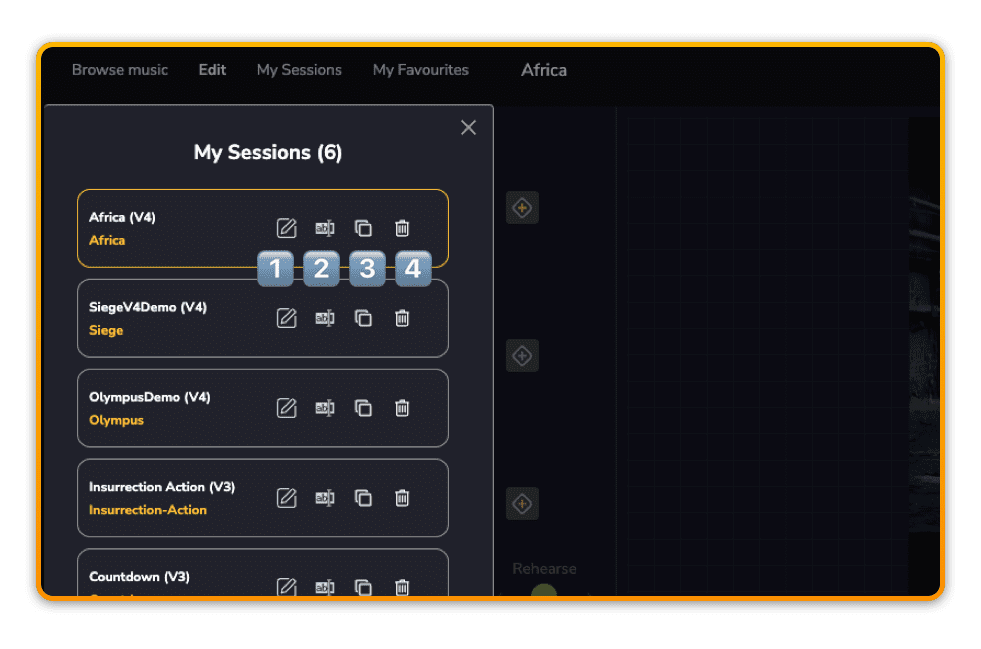 The Sessions tab displays a list of your currently saved Filmstro sessions. You can open each one to continue editing as well as renaming, duplicating and deleting them.