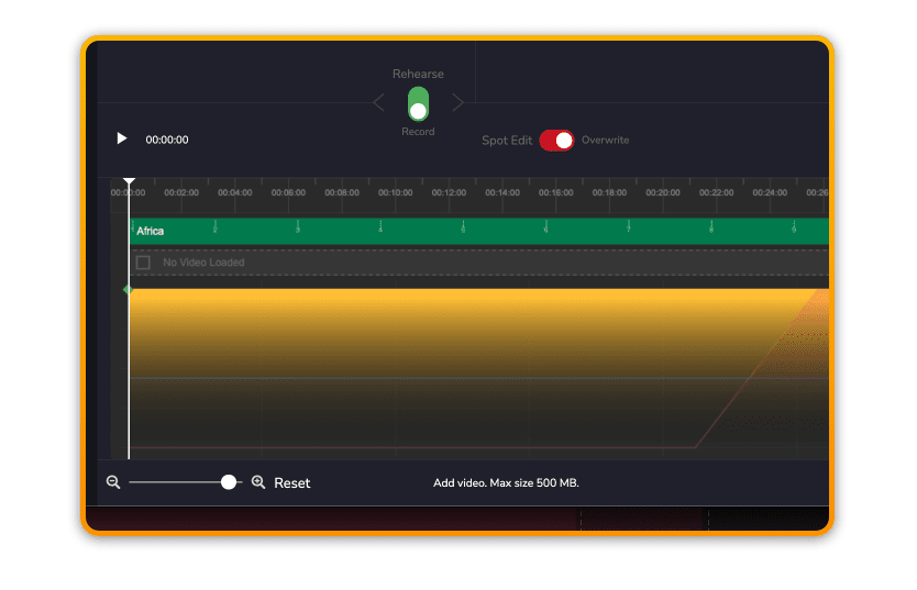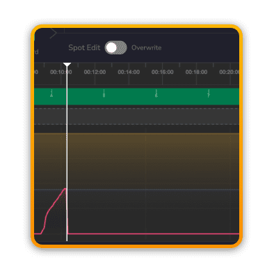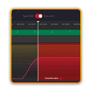 When in Overwrite mode any Scoring Slider changes made – while the playhead is moving – record changes directly at the playhead in addition to applying the changes to the remainder of the entire timeline from the playhead onwards (“overwriting” all previously created data).
